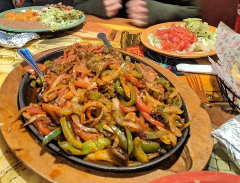Steak or chicken grilled with onions, peppers and tomatoes. Served with salad, rice, beans and three flour tortillas